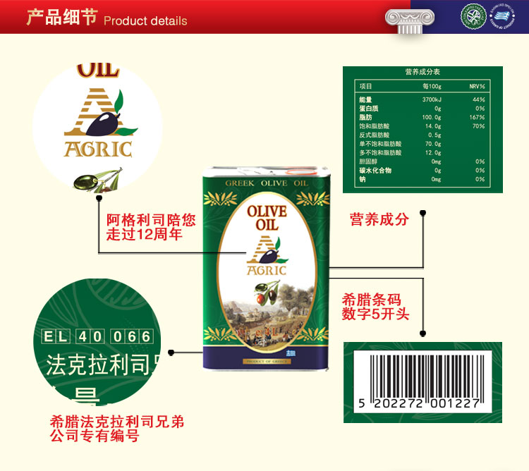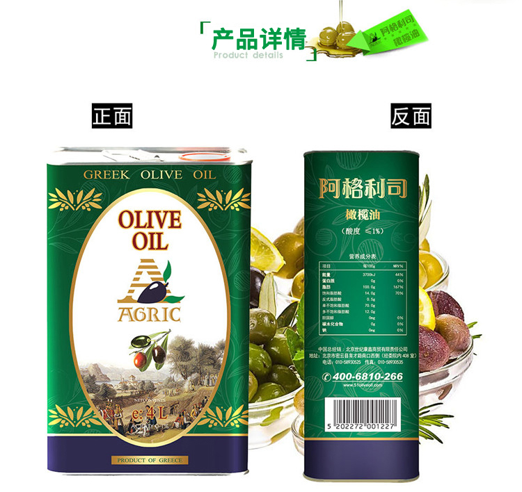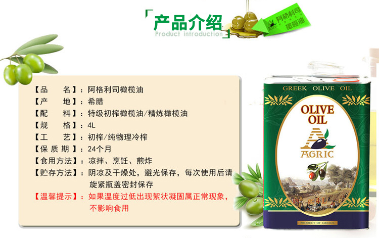 商超同款 阿格利司橄榄油4L升 希腊原装进口食用油家庭厨房实惠装